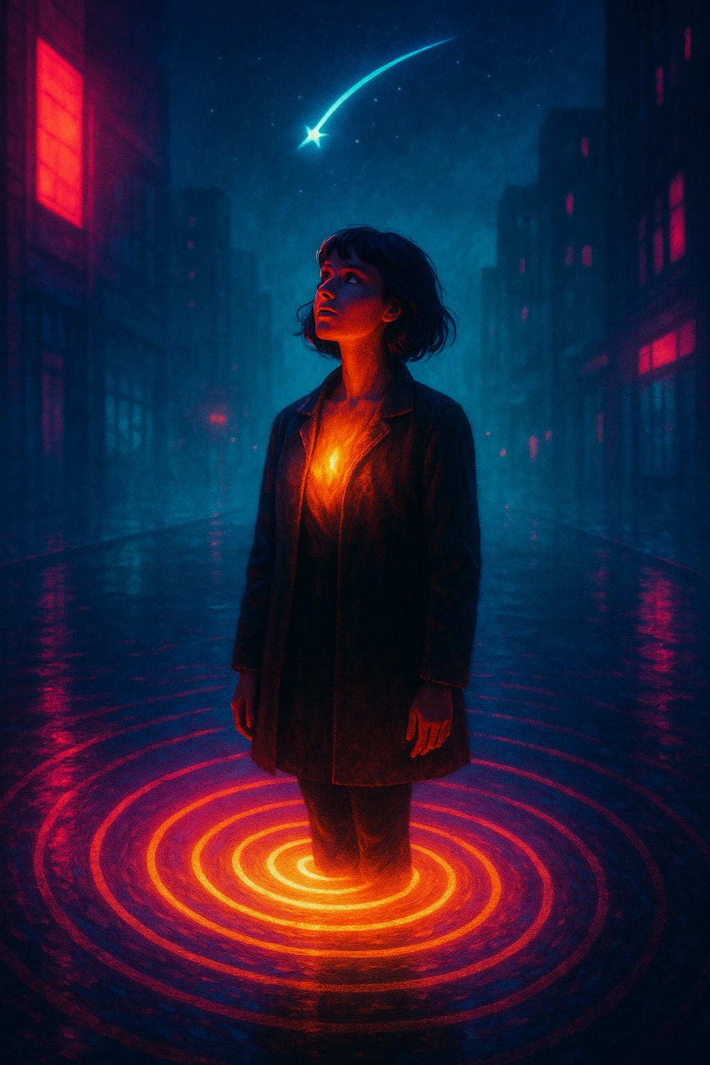 Inside her chest — a bright blue crystal, full of light.